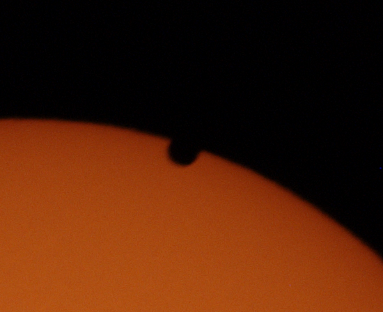 Now the eclipse is starting. That bite on the bottom left is the shadow cast by the planet Earth. The moon is moving down and to the left into the shadow and it will take about an hour to completely enter the shadow. The moon, in its orbit around the Earth, moves noticeably through the night sky, and my rule of thumb is that it moves about one moon diameter in one hour.Look carefully the shape of that shadow. Note that it is curved and fuzzy. The curve is the curvature of the Earth (It's round!) and the fuzz is the distortion of the edge of the shadow by our atmosphere. There is probably a bit of that glowing humidity in there too:-(
